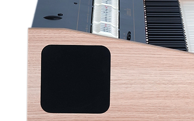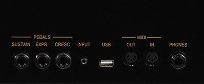 Duży wybór zewnętrznych łączy jest elegancko i wygodnie umieszczony z tyłu urządzenia. Poza standardowymi połączeniami, wejściem MIDI, słuchawkami i wejściami stereo, istnieje także pamięć USB do zapisywania i ładowania ustawień audio i dźwięku w formacie plików MIDI. Ponadto istnieją dwa inne stereofoniczne wyjścia audio przydatne do podłączenia dwóch par opcjonalnych głośników zewnętrznych. Zewnętrzny dźwięk można regulować za pomocą niezależnych 7-punktowych korektorów dla każdego kanału. Główna regulacja głośności i pogłos są wygodnie umieszczone z przodu instrumentu.