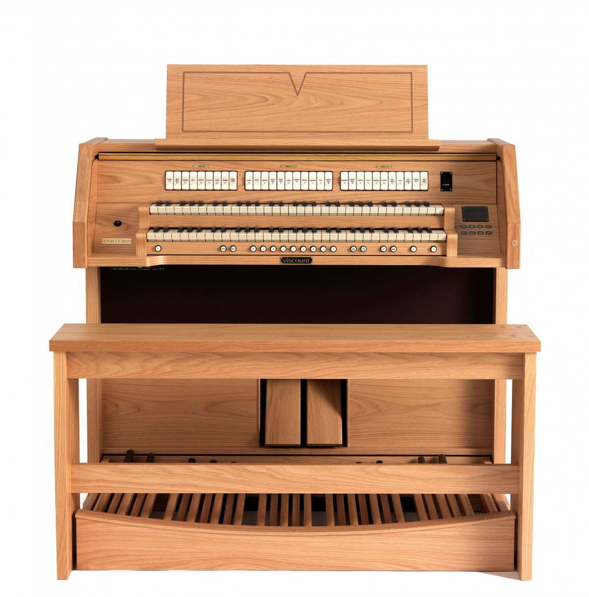 Włączniki rejestrów, przyciski i wszystkie inne elementy sterujące są ergonomicznie rozmieszczone i reagują dokładnie na operacje użytkownika. Włączniki rejestrów do włączania i wyłączania głosów, przyciski i wszystkie inne elementy sterujące są ergonomicznie rozmieszczone i reagują dokładnie na operacje użytkownika. Wyświetlacz umieszczony z boku (pośrodku w CLV 7, UNICO 300, 400, 500, 700, w specjalnej szufladzie w UNICO 800) z odpowiednimi elementami sterującymi, ma wyraźny wygląd, który dobrze integruje się z instrumentem, oferując liczne możliwości dostępnych funkcji.